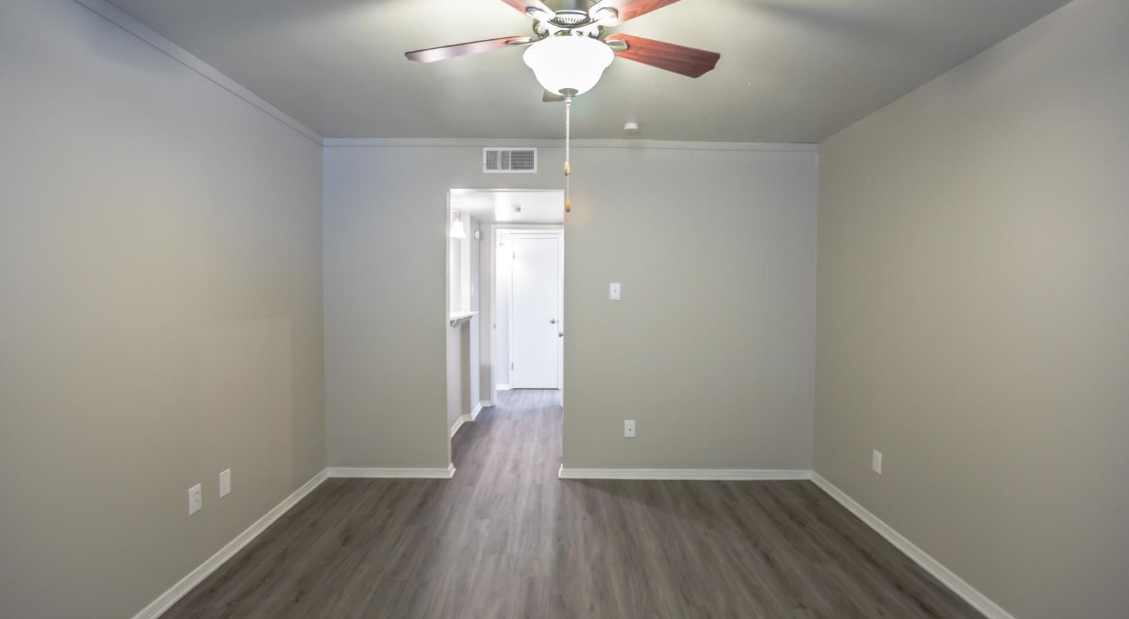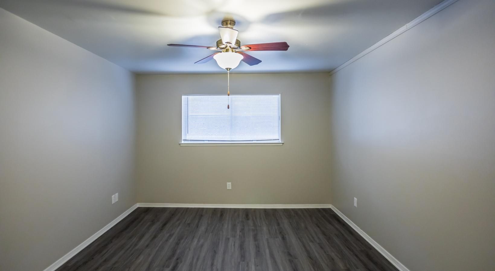 • a room with a ceiling fan and a wood floor