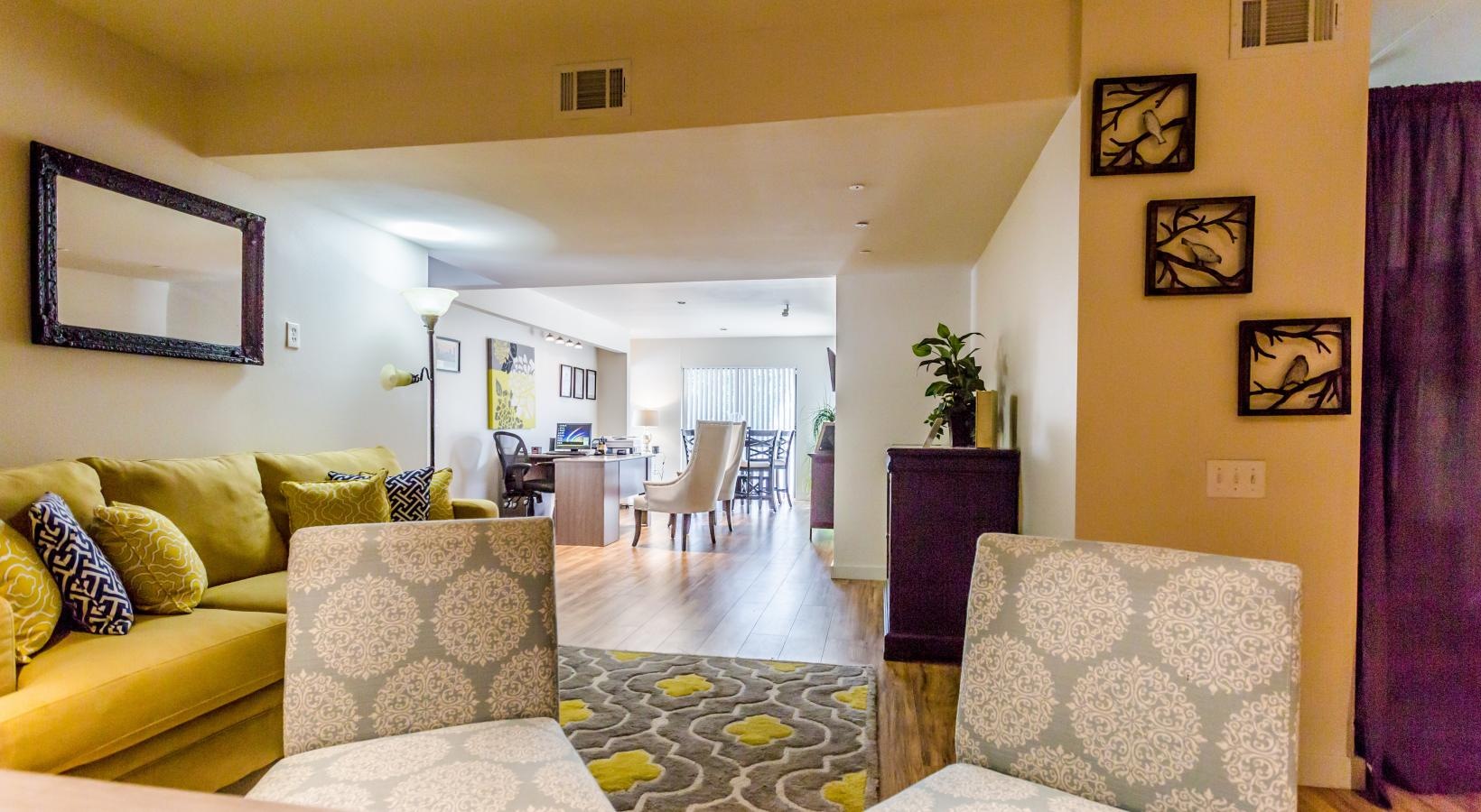 • a living room with yellow couches