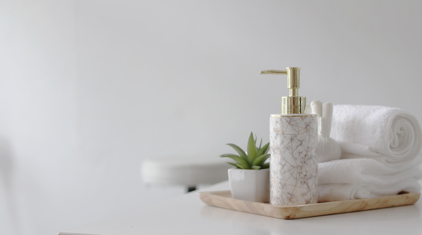 • tray of towels, soap pump bottle and potted succulent in bathroom