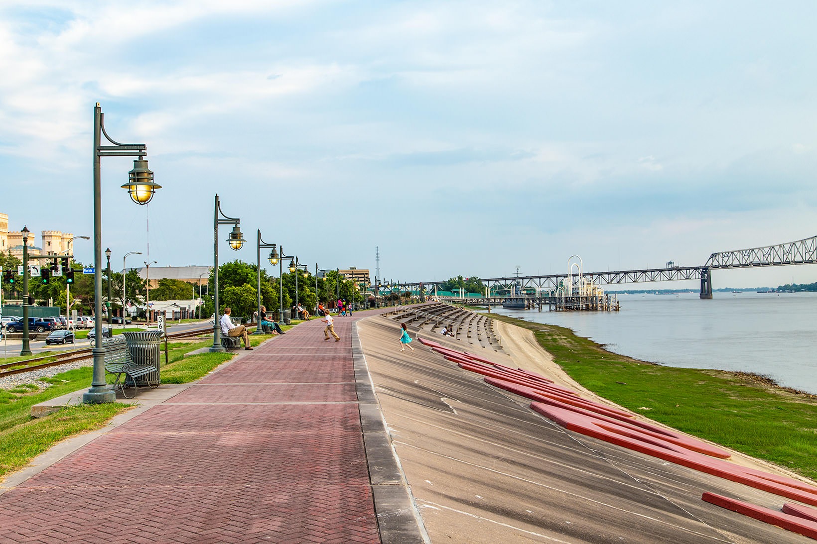 • people playing and sitting near the river bank