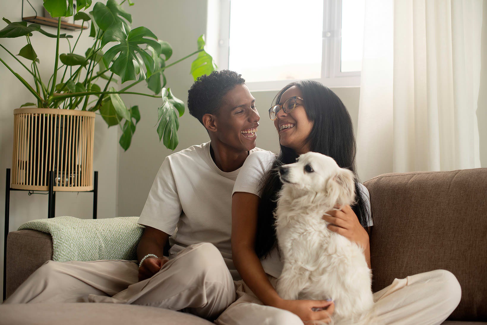 • a young couple sit on couch with their dog