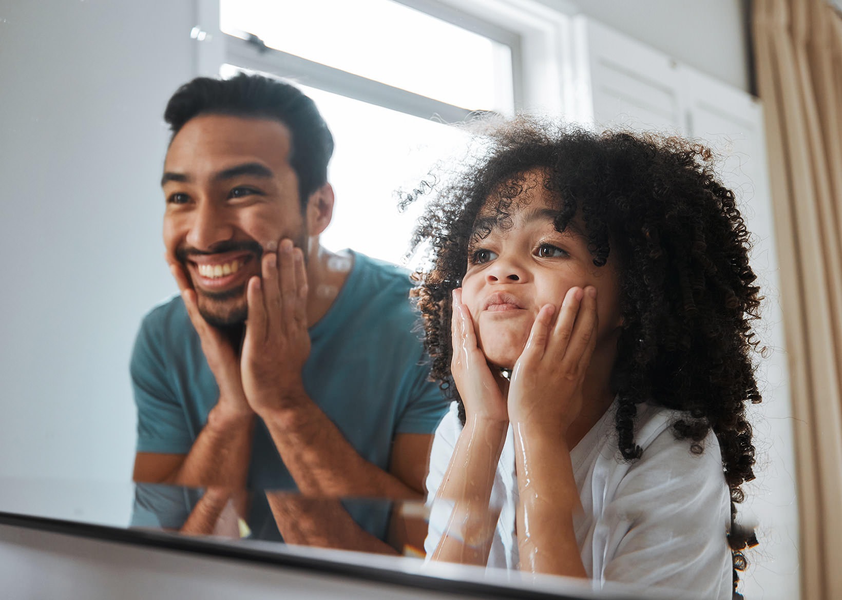 • father and daughter look in the mirror together