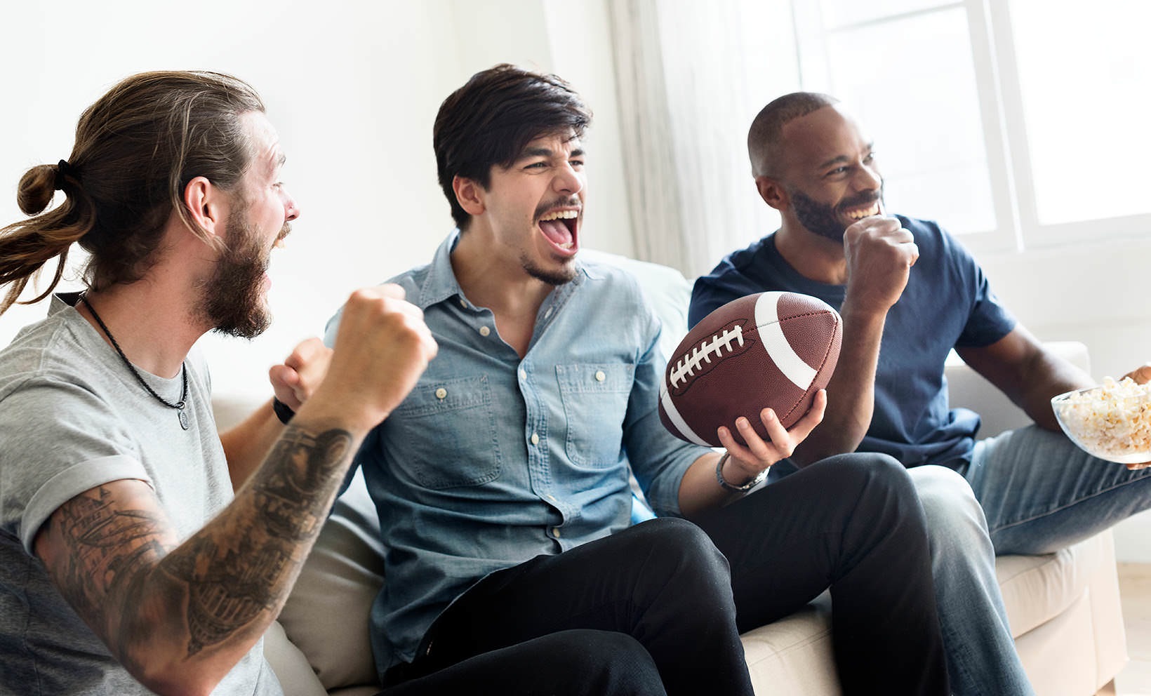 • men sitting on couch get excited about football