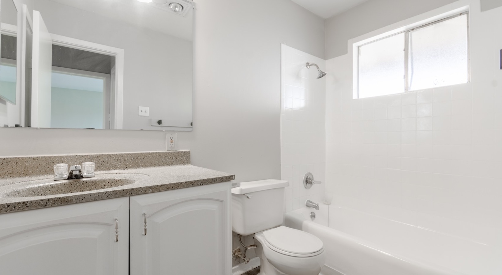 • a well-lit bathroom with a window, sink, and mirror