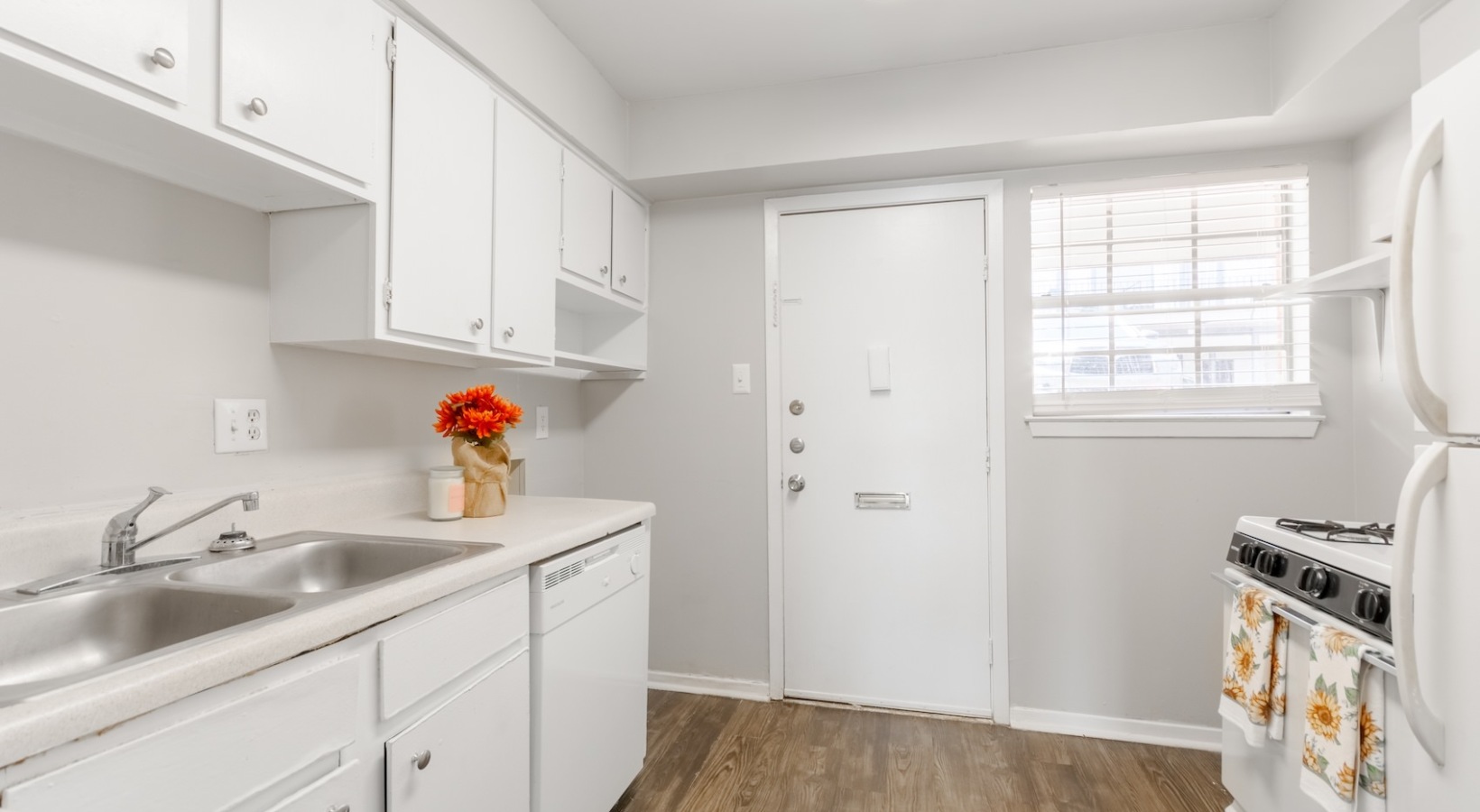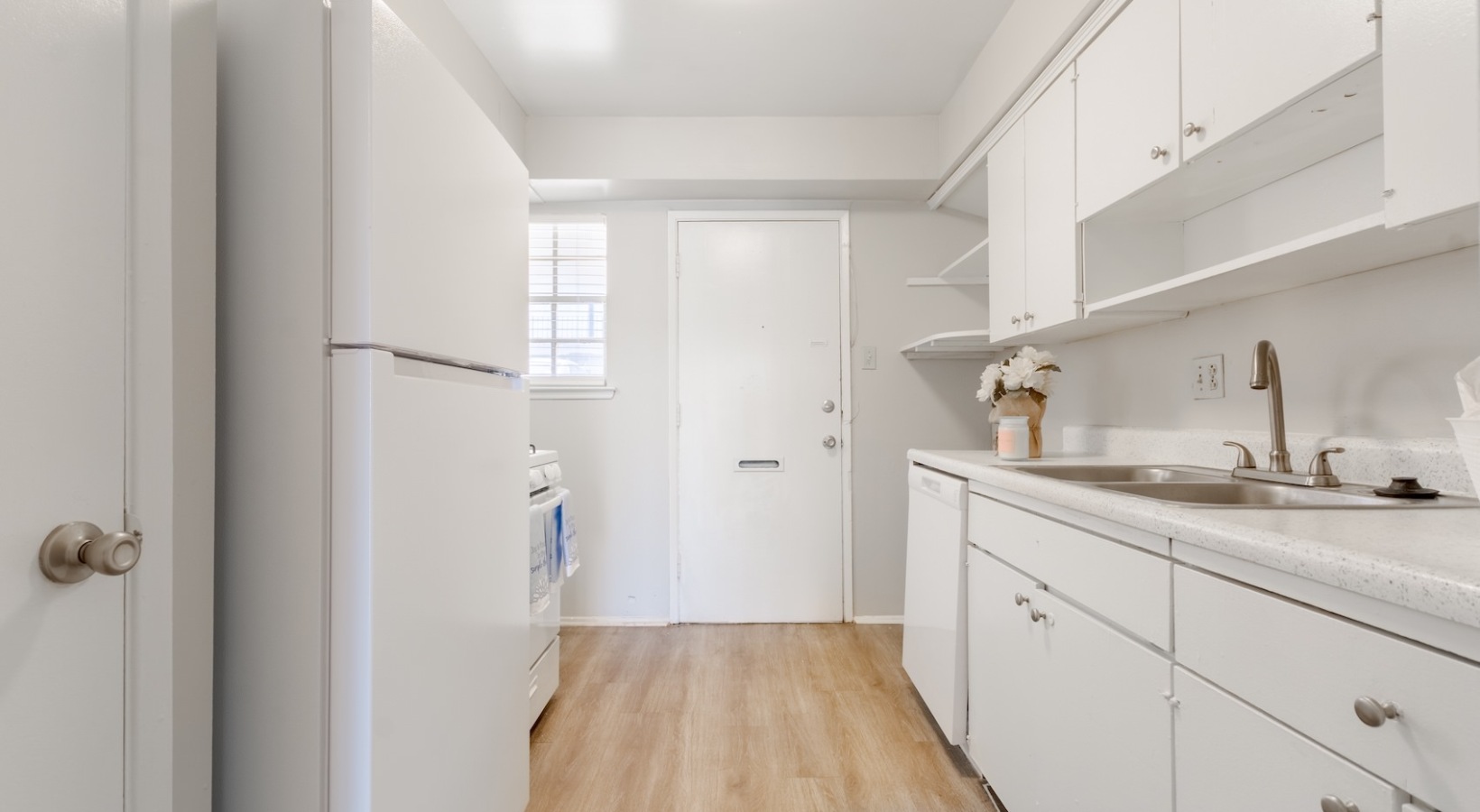 • a kitchen with white cabinets