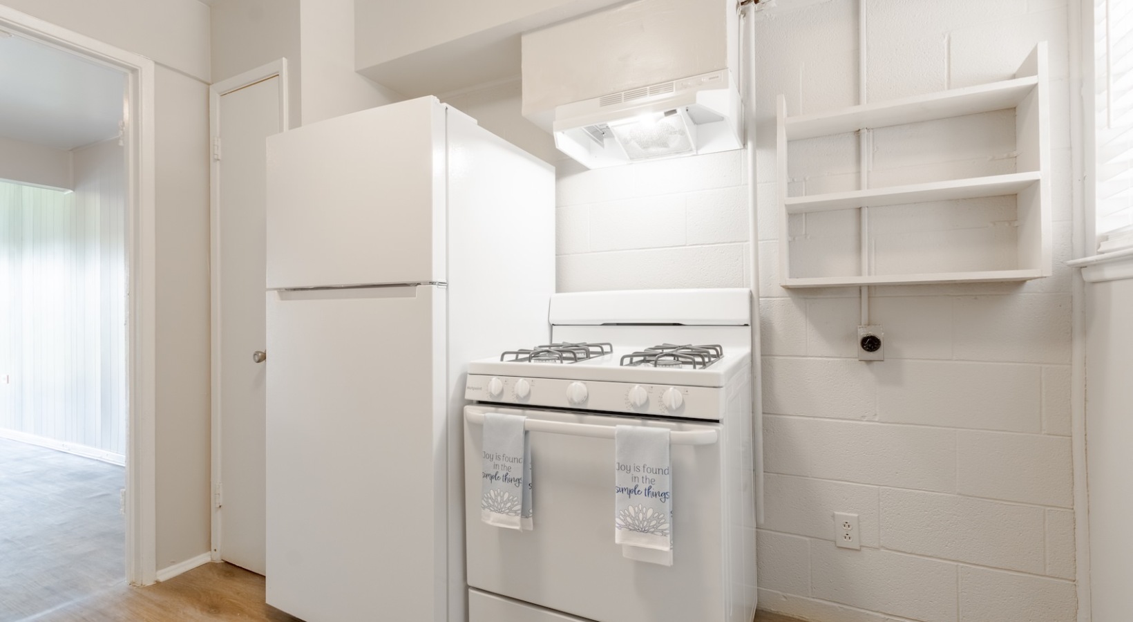 • Well-lit kitchen with ample shelving